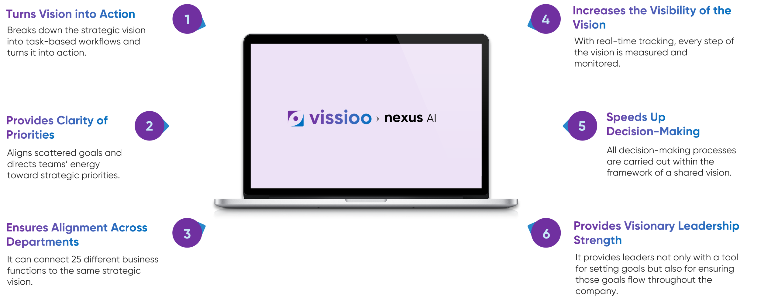 Vissioo Nexus AI is a system that uses artificial intelligence to plan your company’s growth vision, align it with goals, and distribute it across business functions.